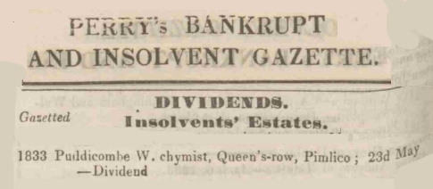 | In 1833, soon after acquiring the apothecary business, William filed for insolvency. Dividends were still being paid in 1838. |