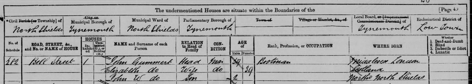 John Matthew James GUMMET died in the Union Workhouse in Tynemouth, aged 80, on the 23rd December 1893. He was suffering from 'Senectus' (basically old age). His widow, Elizabeth, many years his junior, lived until she was 76 but she too had gone to the Workhouse and she died in the Infirmary on the 18th December 1910.