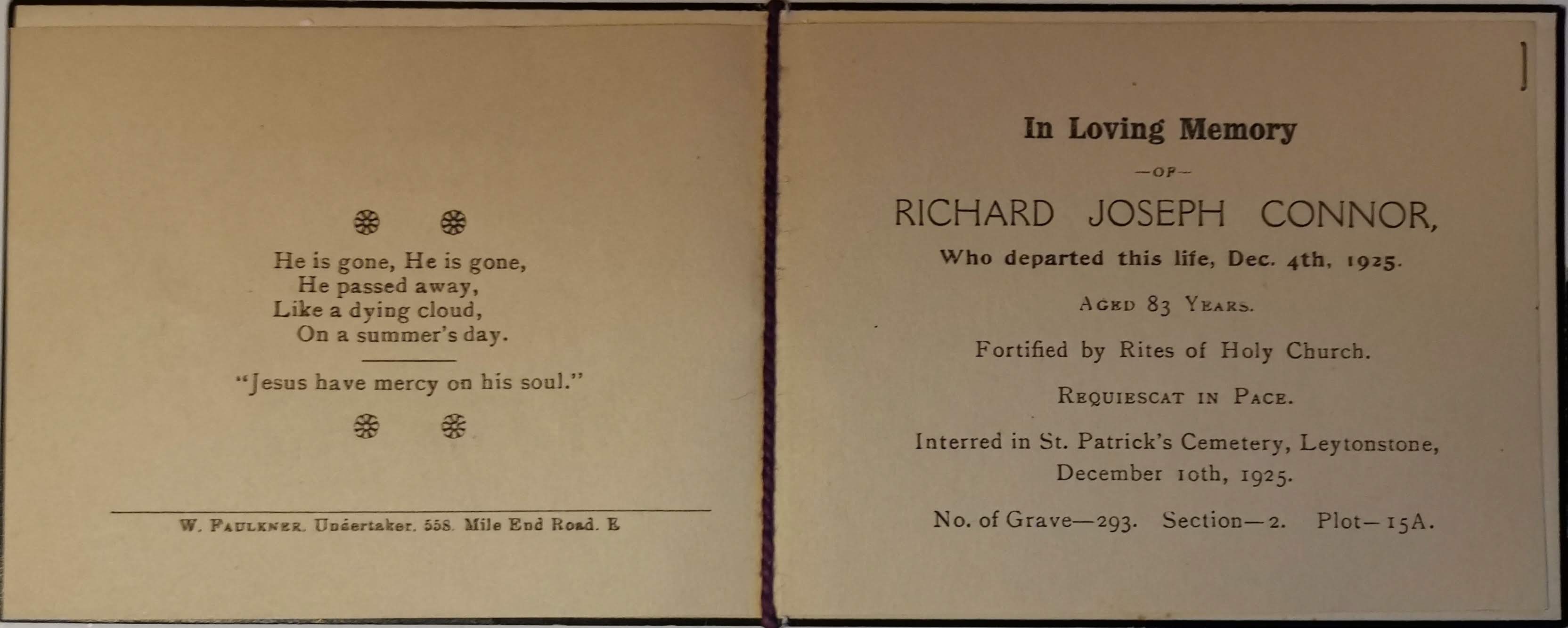 4 Dec 1925 aged 83 (KVG) buried together with Flavella in St Patrick's Cemetery, Leytonstone, East London (ES) |