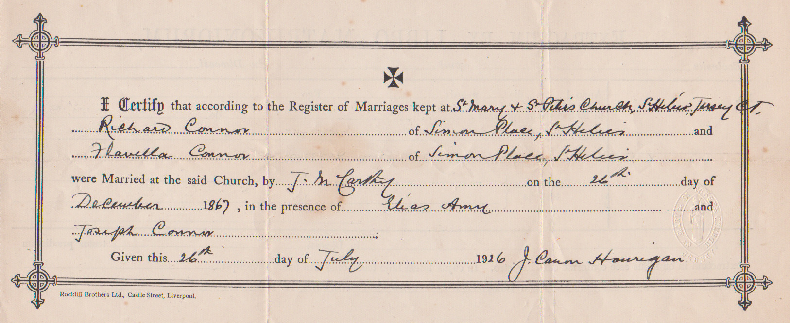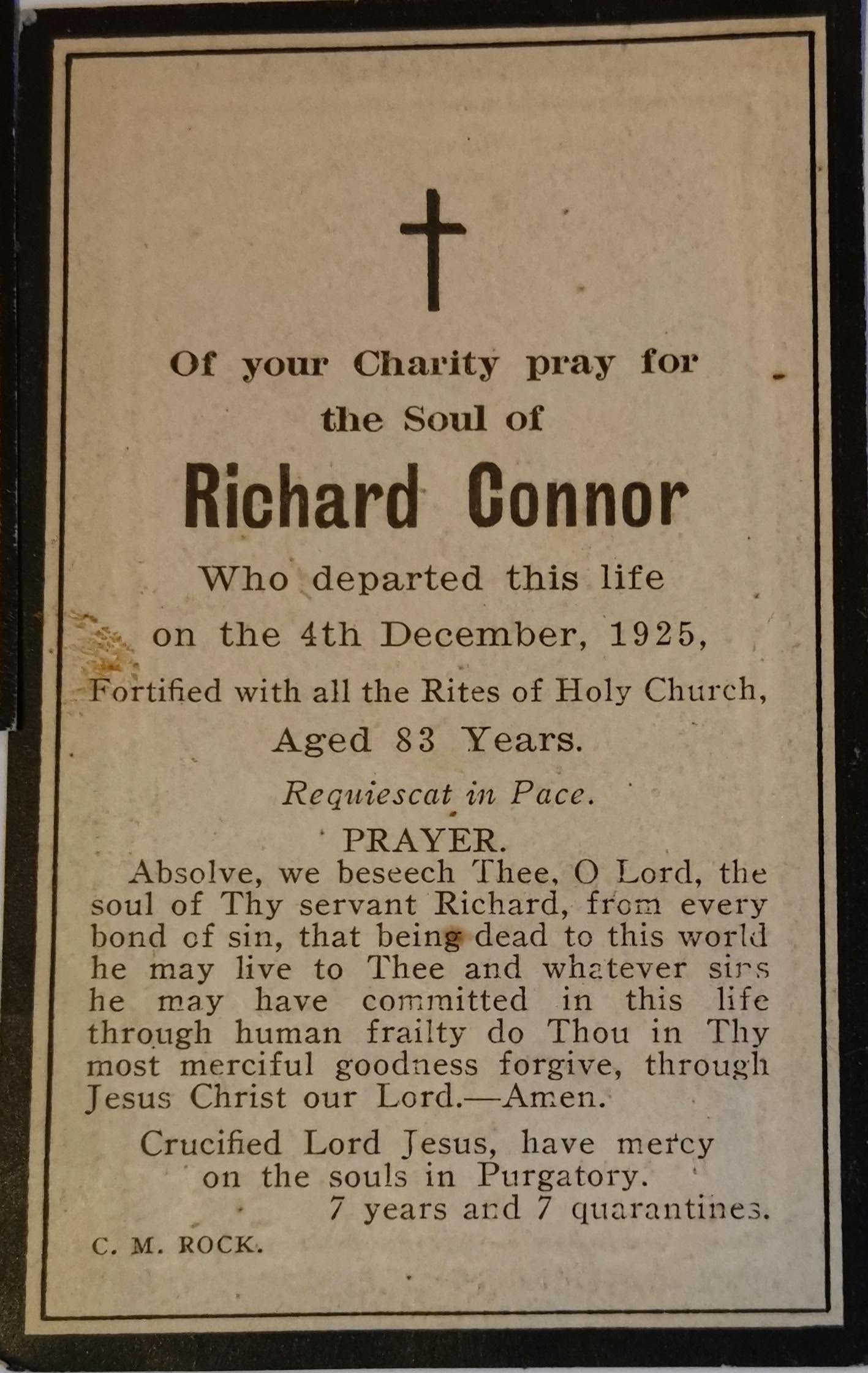 According to family lore, Richard reputedly dropped the "O'" from O'CONNOR, following an argument over the certificate at his wedding - he certainly had a fiery temper as a grandfather! (KVG) |