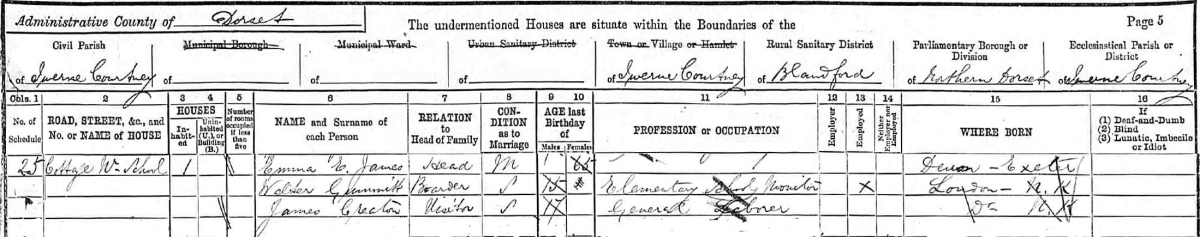 1891 census Cottage within school, Iwerne Courtney, Dorset (boarder)