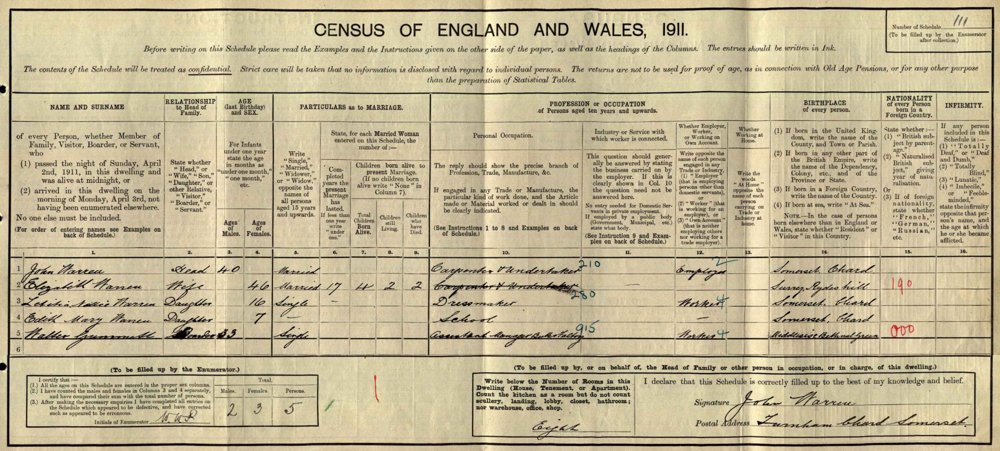 1911 census Furnham Road, Chard, Somerset (boarder)
