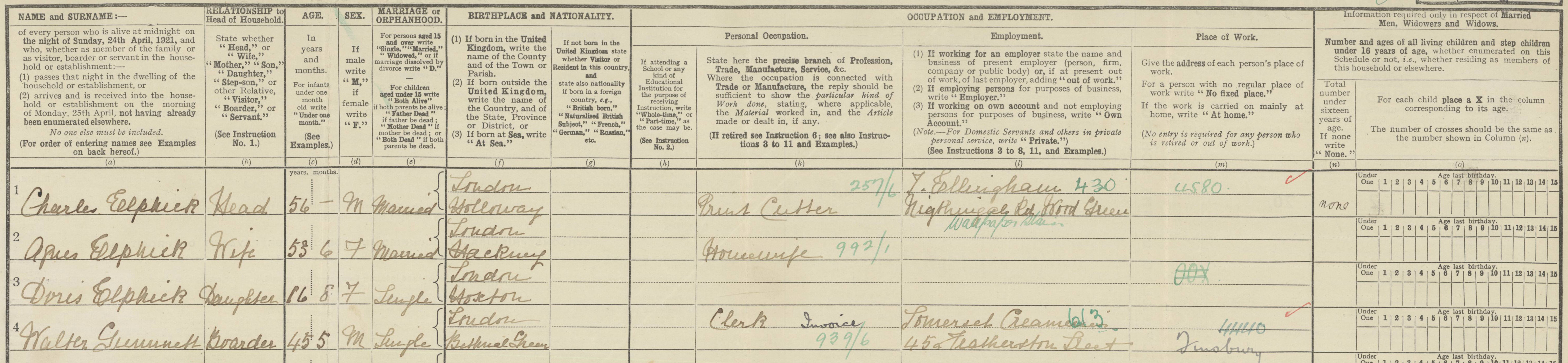 1921 census 23, Maury Road, Stoke Newington, London (boarder) |
