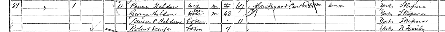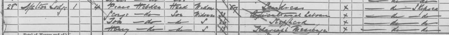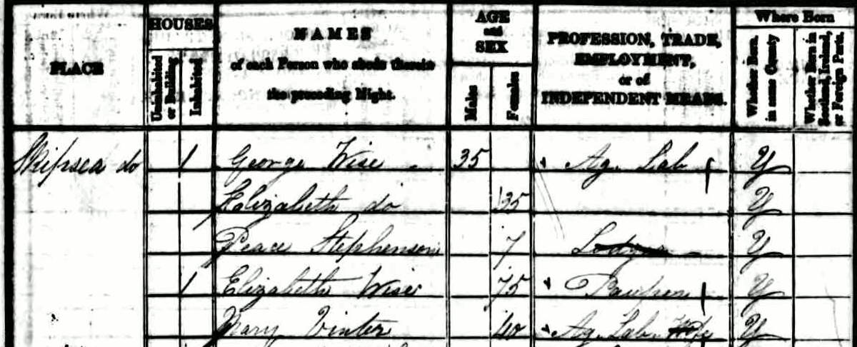 Peace's Mother was Jane STEPHENSON, but no father (IGI) At the age of just 7 in 1841, Peace was living with her uncle George WISE his wife Elizabeth (nee STEPHENSON?), and was described as a lodger. |