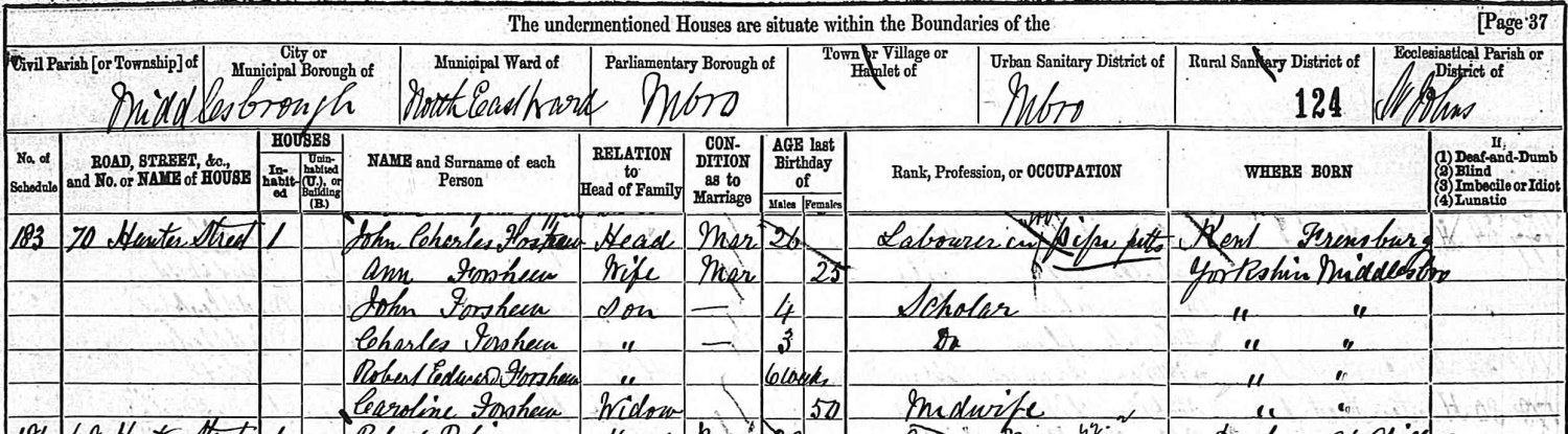 1871 census Bridge Court(?) High Street, Strood, Rochester, Kent 1881 census 7, Hunter Street, Middlesborough, Yorkshire
