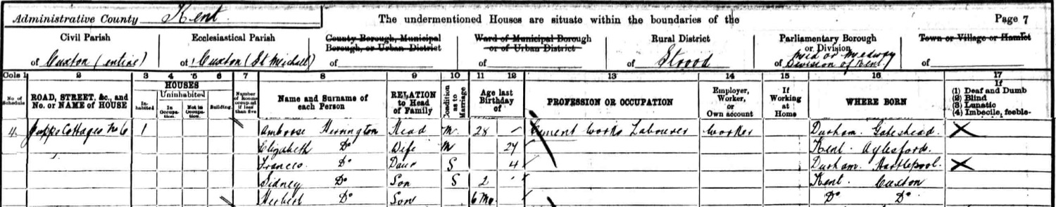 (1881 cen) Gateshead (VF) bapt 7 Jun 1874 Saint Nicholas, Rochester, Kent (PR) |