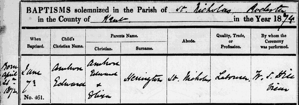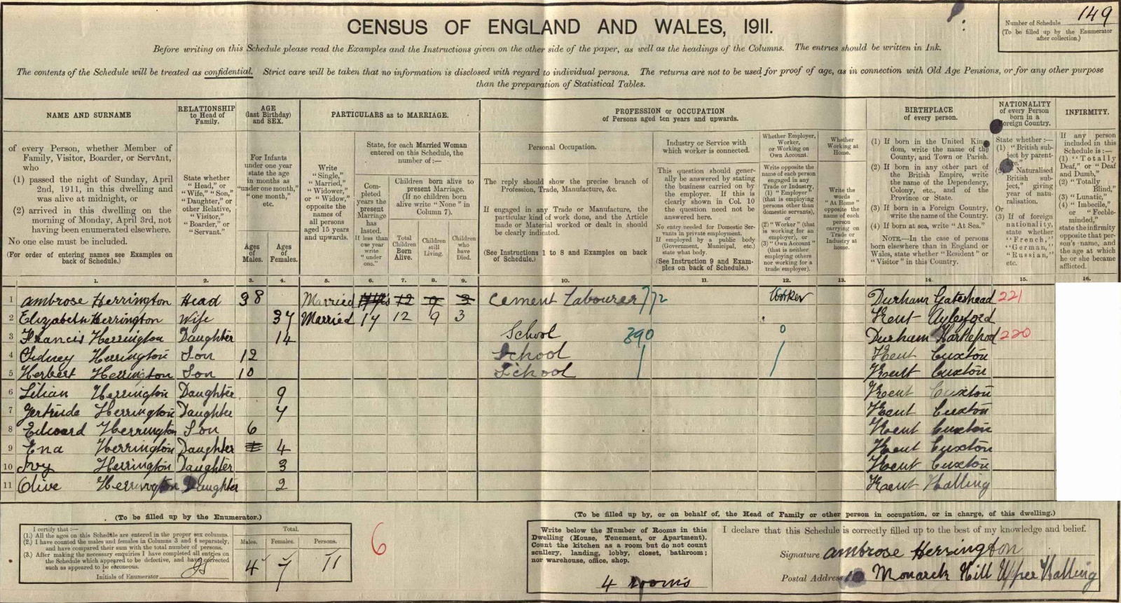 | The birth of an Ambrose Edwards (sic) HERRINGTON is recorded in 1895 (D/1895, Hartlepool, 10a, 129) (Free BMD) - perhaps a son? or a nephew?... Sadly his death aged 2 is recorded in 1898 (S/1898, Strood, 2a, 382) (Free BMD) | ||