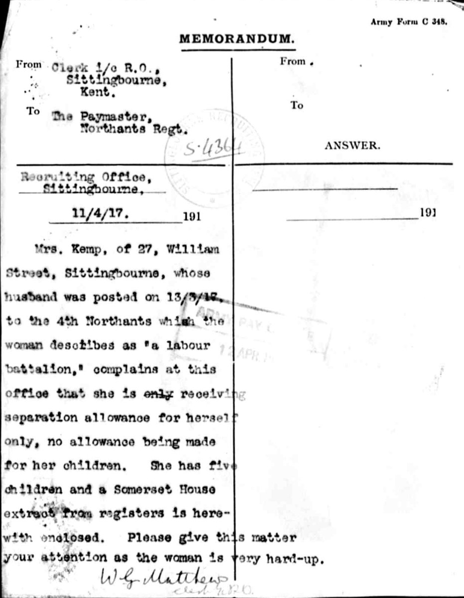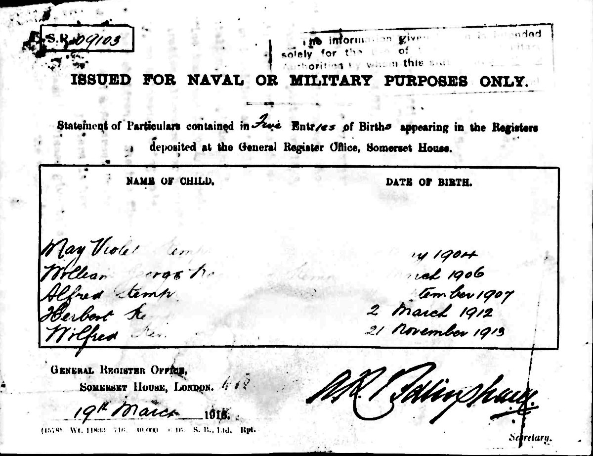 When Reginald was serving in WW1, Lily wasn't receiving the correct support and complained to the recruiting office with evidence from Somerset House about the children she was responsible for. |