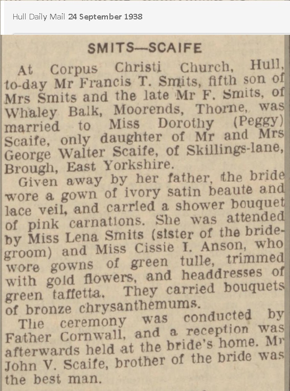 24 Sep 1938 (cert) Corpus Christi church, Spring Bank West, Hull E Yorks (cert) spouse